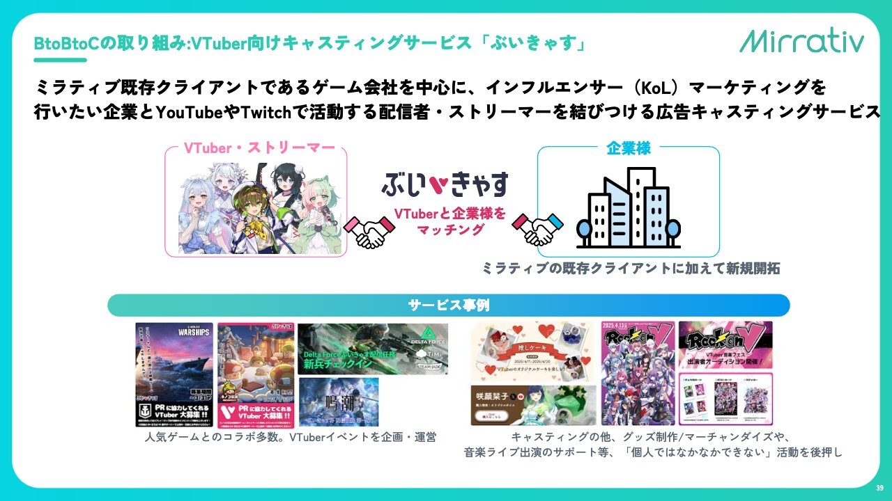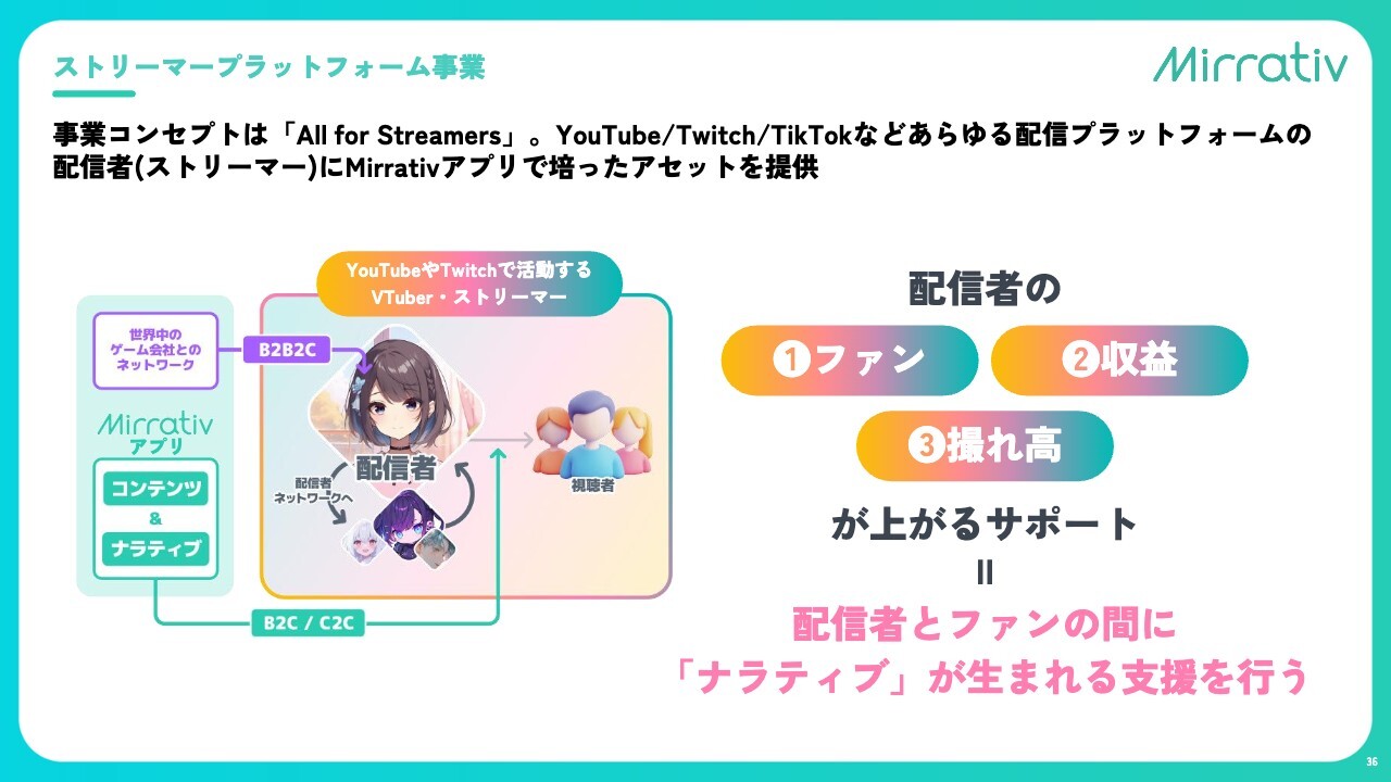 BtoBについては、個人VTuberをネットワーク化し、私たちが持つゲーム会社とのネットワークとつなげていく取り組みを進めています。ゲーム会社の視点では「Mirrativ」だけでなく、個人VTuberにもプロモーションを依頼するものです。双方に需要があり、堅実に成長させられると考えており、すでに結果が出始めています。