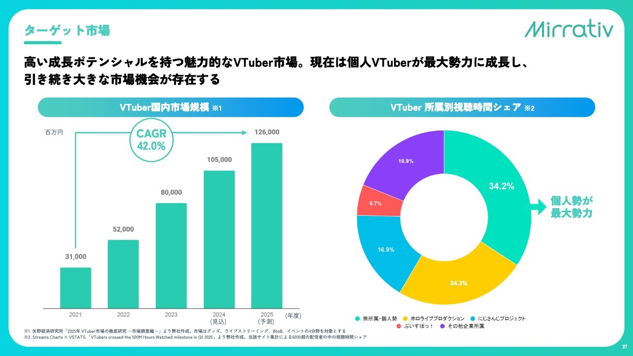 一方で、この個人VTuberの方々は、大手事務所のような支援を受けられていないのが現状です。当社がプラットフォームとして、いかに彼らのポテンシャルを引き出し、活かしていくかが、キーとなると考えています。