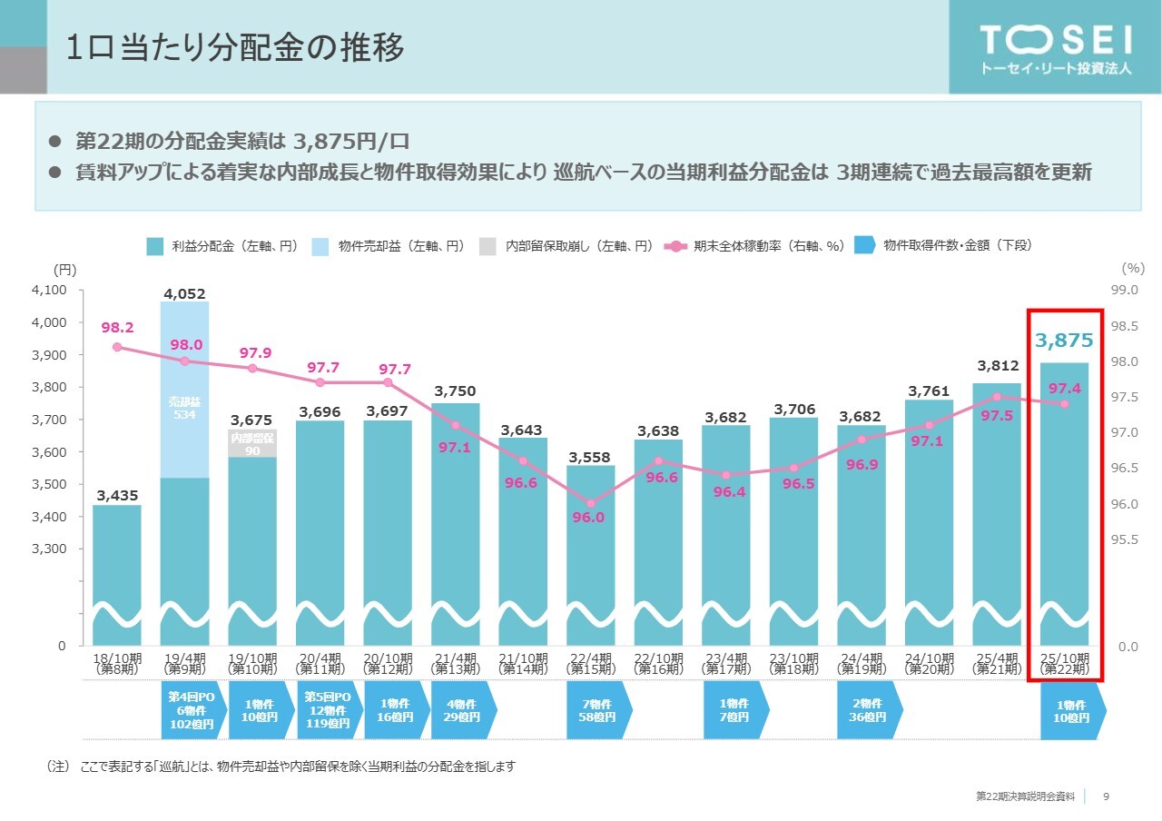 まず1点目は、分配金についてです。第22期の分配金は、前期比プラス63円の3,875円となりました。売却益や内部留保の取崩しを除いた巡航ベースでの利益分配金として、3期連続で過去最高額を更新しています。地道な賃料増強策が安定した分配金の拡大につながっています。