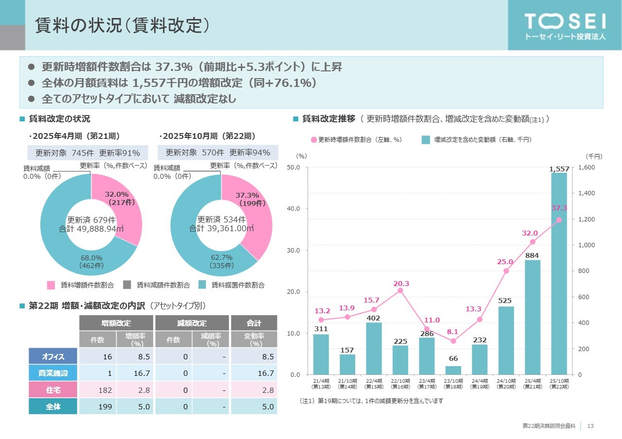 季節要因により、10月期の更新件数は4月期に比べて減少する傾向がありますが、増額件数割合とともに増額率も改善しているため、月額賃料は前期比で76パーセントの増額を確保しました。今期もすべてのアセットタイプで増額改定が進捗し、減額改定はありませんでした。