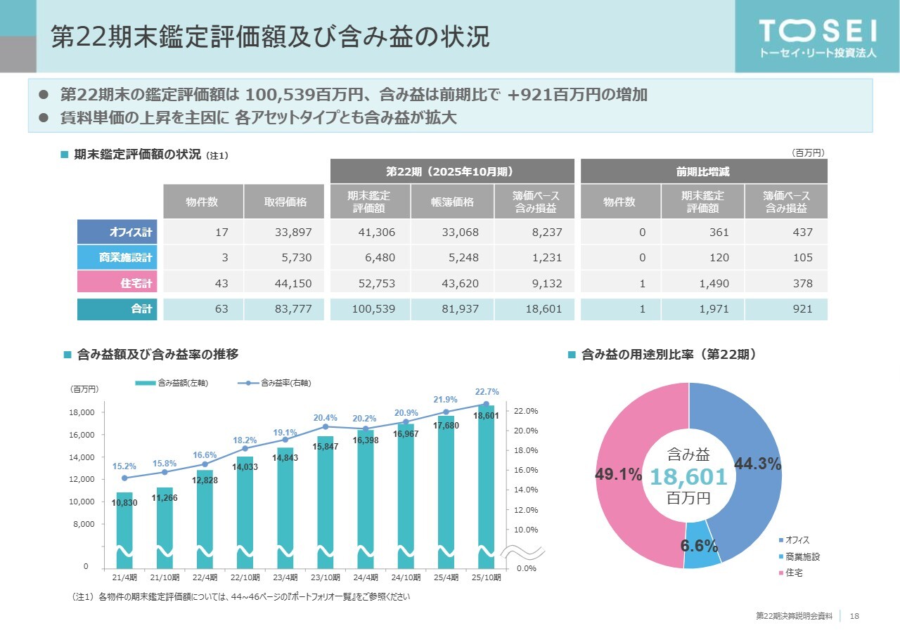 第22期末の鑑定評価額は、新規に取得した物件を含め1,005億円です。含み益は前期末比で9億円増加し、186億円となりました。各アセットタイプとも含み益が拡大し、含み益率は22.7パーセントとなっています。