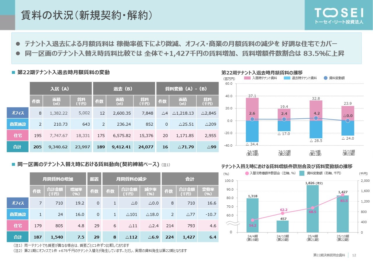 スライド左下の表では、同一区画におけるテナントの入替えによる賃料の変化を比較しています。第22期中に発生した224件の入替えのうち、187件で賃料の増額が実現しました。増加した件数割合は83.5パーセントで、前期の68.5パーセントをさらに上回っています。
