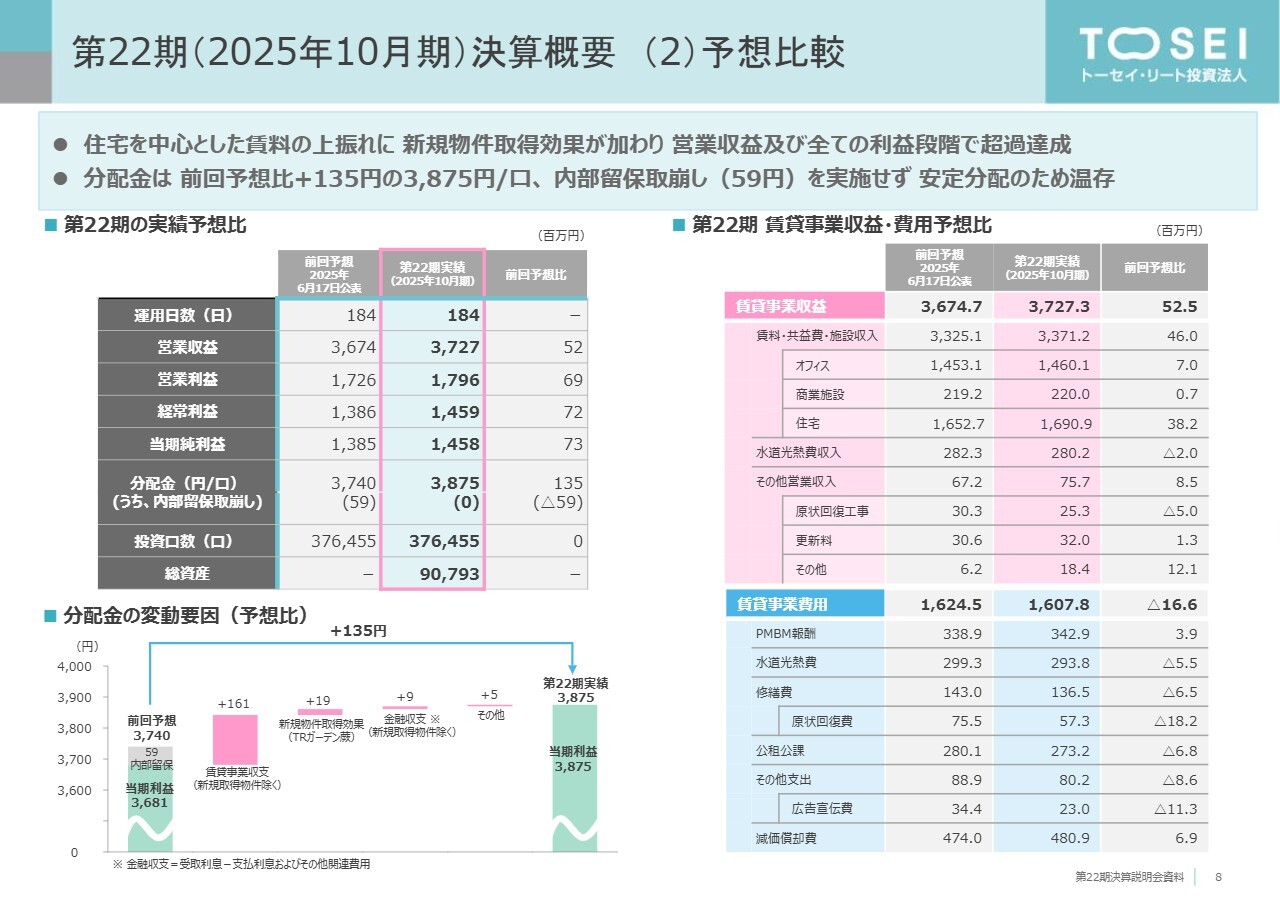 予想比較についてご説明します。第22期は、住宅を中心とした賃料の上振れに新規物件取得効果が加わり、営業収益及びすべての利益段階で大幅な超過達成となりました。