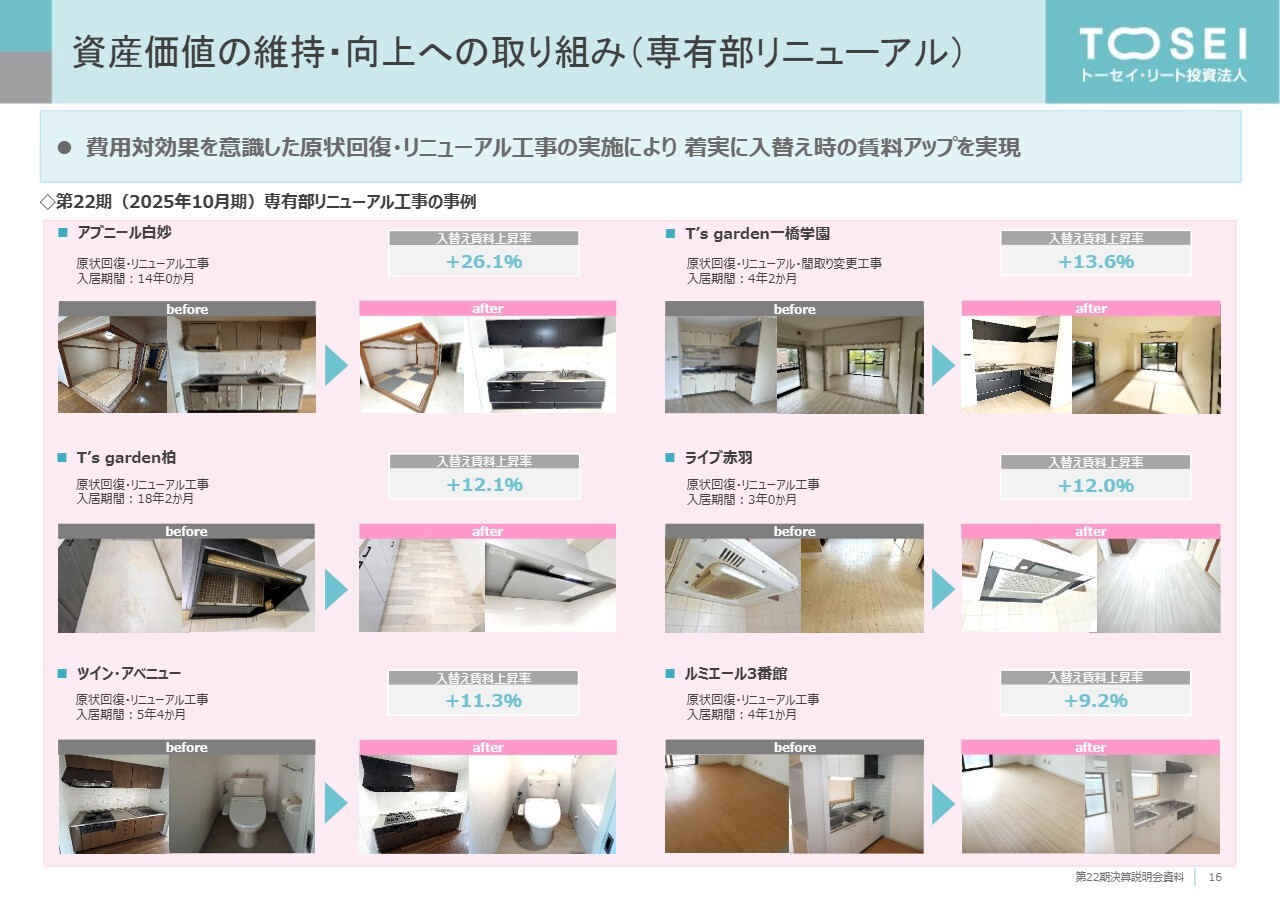 専有部のバリューアップ工事の事例を紹介します。住宅を中心に、専有部のバリューアップ工事が賃料アップにつながっています。テナントの入替えに合わせ、資産の状況を確認しつつバリューアップ工事を進めていますが、進捗状況はまだ低水準にとどまっています。今後も継続して実施していく方針です。