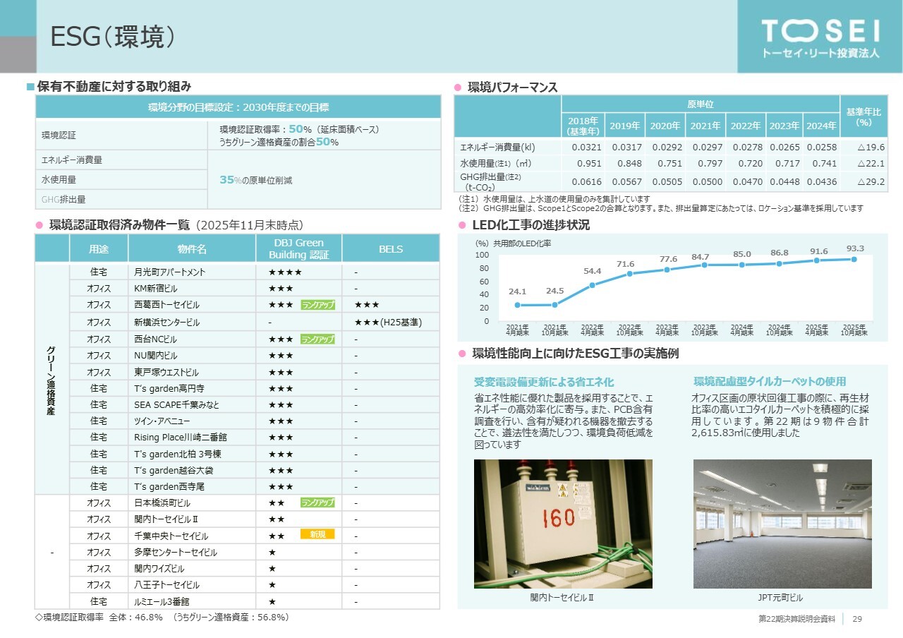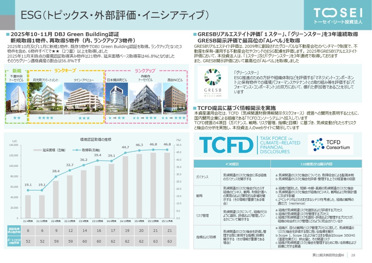 この結果、認証取得比率は46.8パーセントとなり、うちグリーン適格資産の割合は56.8パーセントに上昇しています。今後もトーセイ・リートらしいESG貢献を続けていきます。