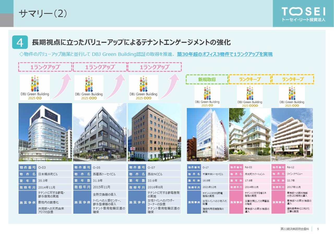4点目はバリューアップ事例です。物件のバリューアップ施策として、DBJ Green Building認証の取得を推進しました。築30年以上の3物件で1ランクアップを達成し、新たに2物件でDBJ Green Building認証の3つ星を獲得しました。