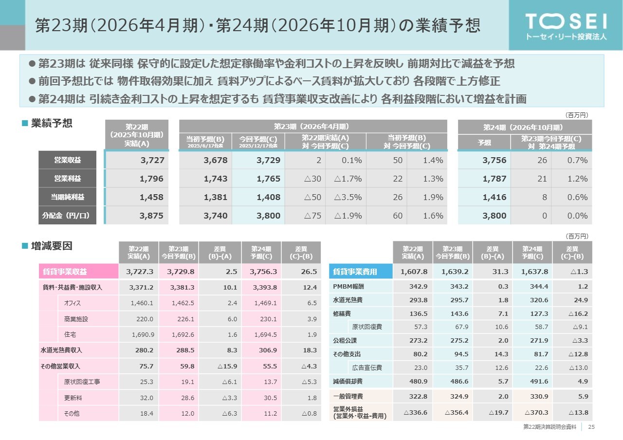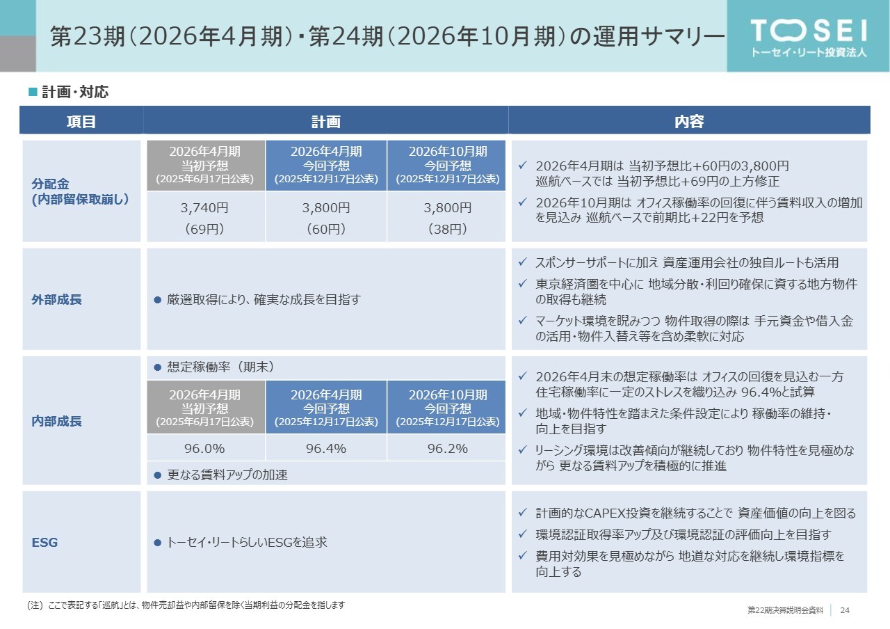 第24期の分配金については、支払金利やその他のコストのさらなる上昇を織り込んでいますが、賃貸事業収支の改善で賄う予定です。