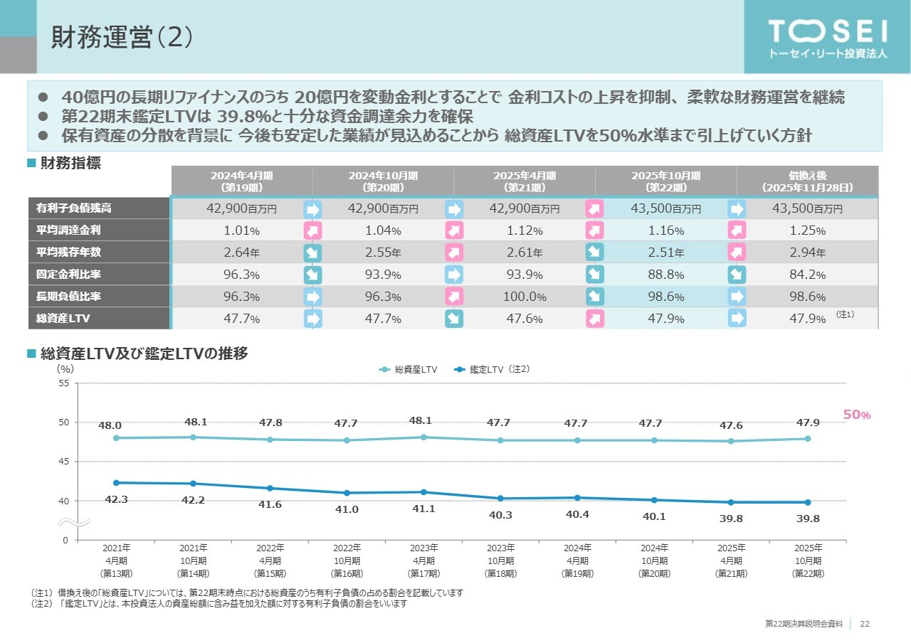 鑑定LTVは40パーセントを下回る水準に低下しており、資金調達力が増しています。LTVについては、引き続き総資産をベースとしますが、保有資産の分散を背景に安定した業績が見込めることから、総資産LTVを50パーセント水準まで引き上げることも視野に入れています。