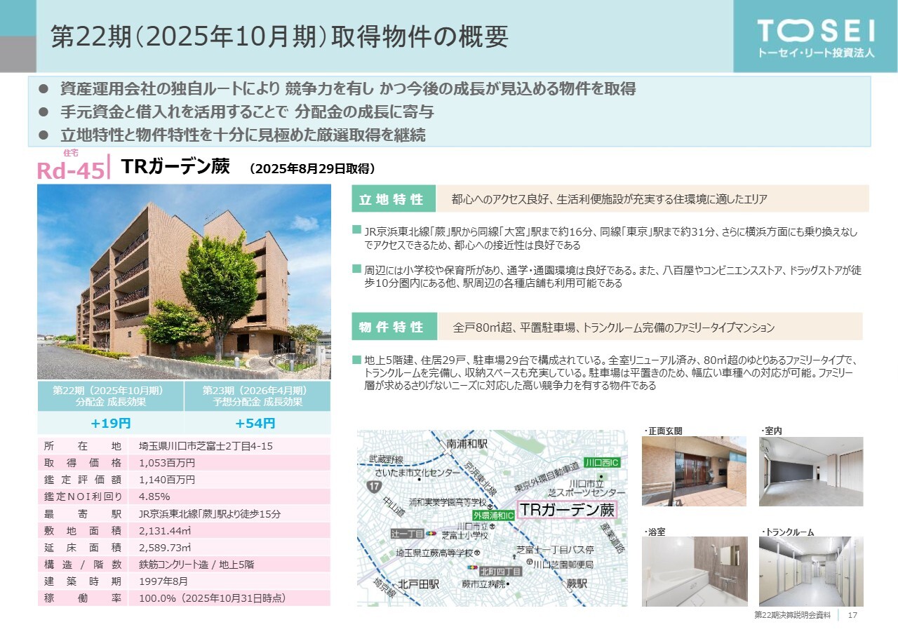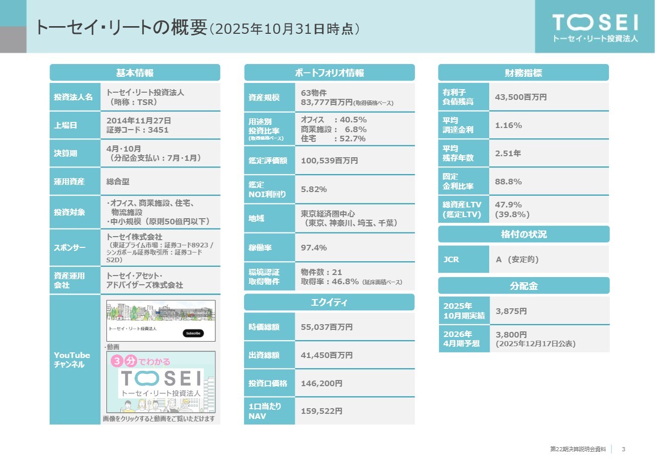 大河内幸貴氏:こんにちは。トーセイ・アセット・アドバイザーズ株式会社REIT運用本部長兼投資運用部長の大河内です。本日はお忙しい中、トーセイ・リート投資法人の第22期決算説明会にご参加いただき、誠にありがとうございます。