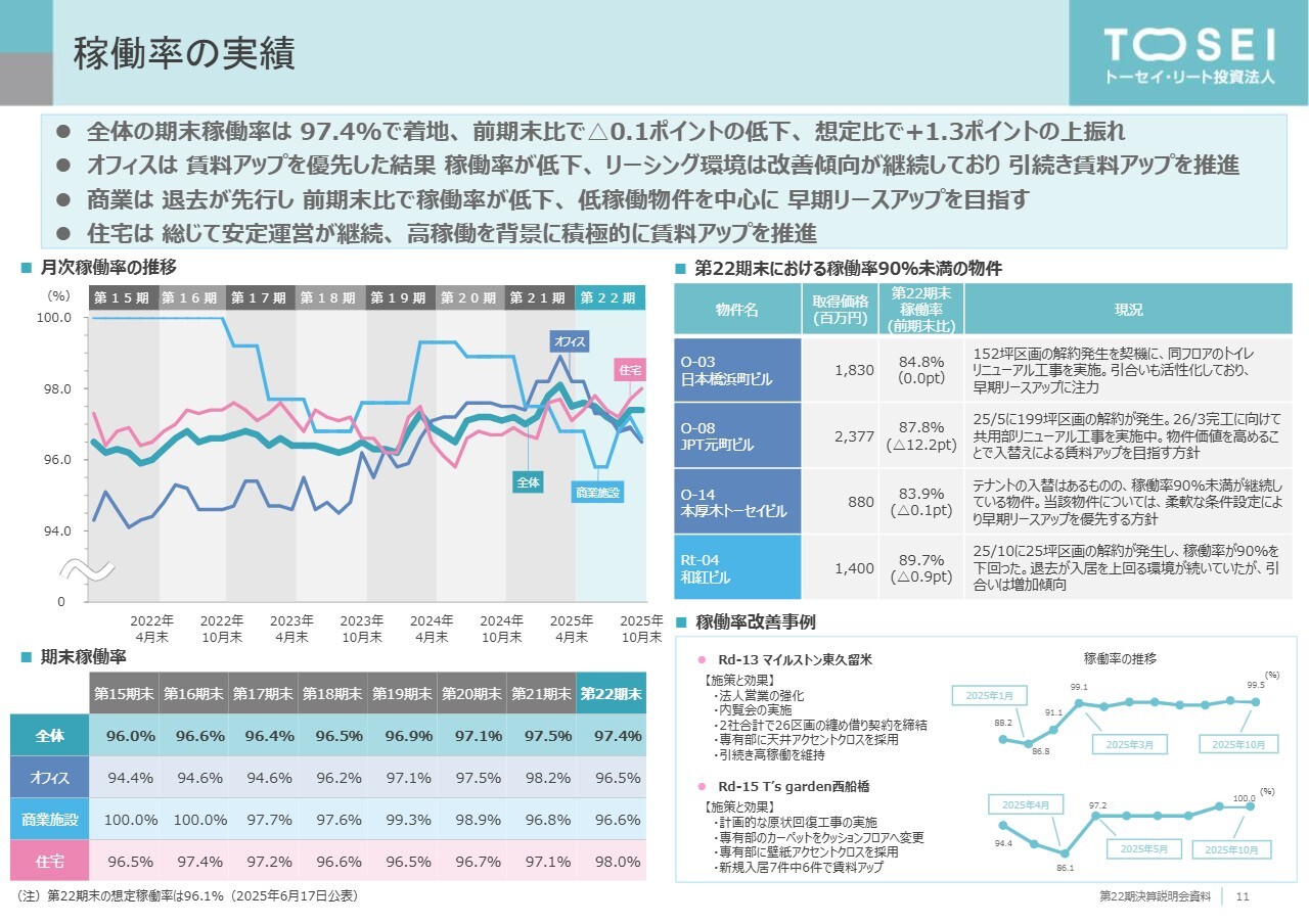 運用実績についてご説明します。スライド左下の稼働率の実績をご覧ください。第22期末の全体稼働率は97.4パーセントとなりました。前期末比では0.1ポイント低下しましたが、前回予想対比では1.3ポイント上振れしています。