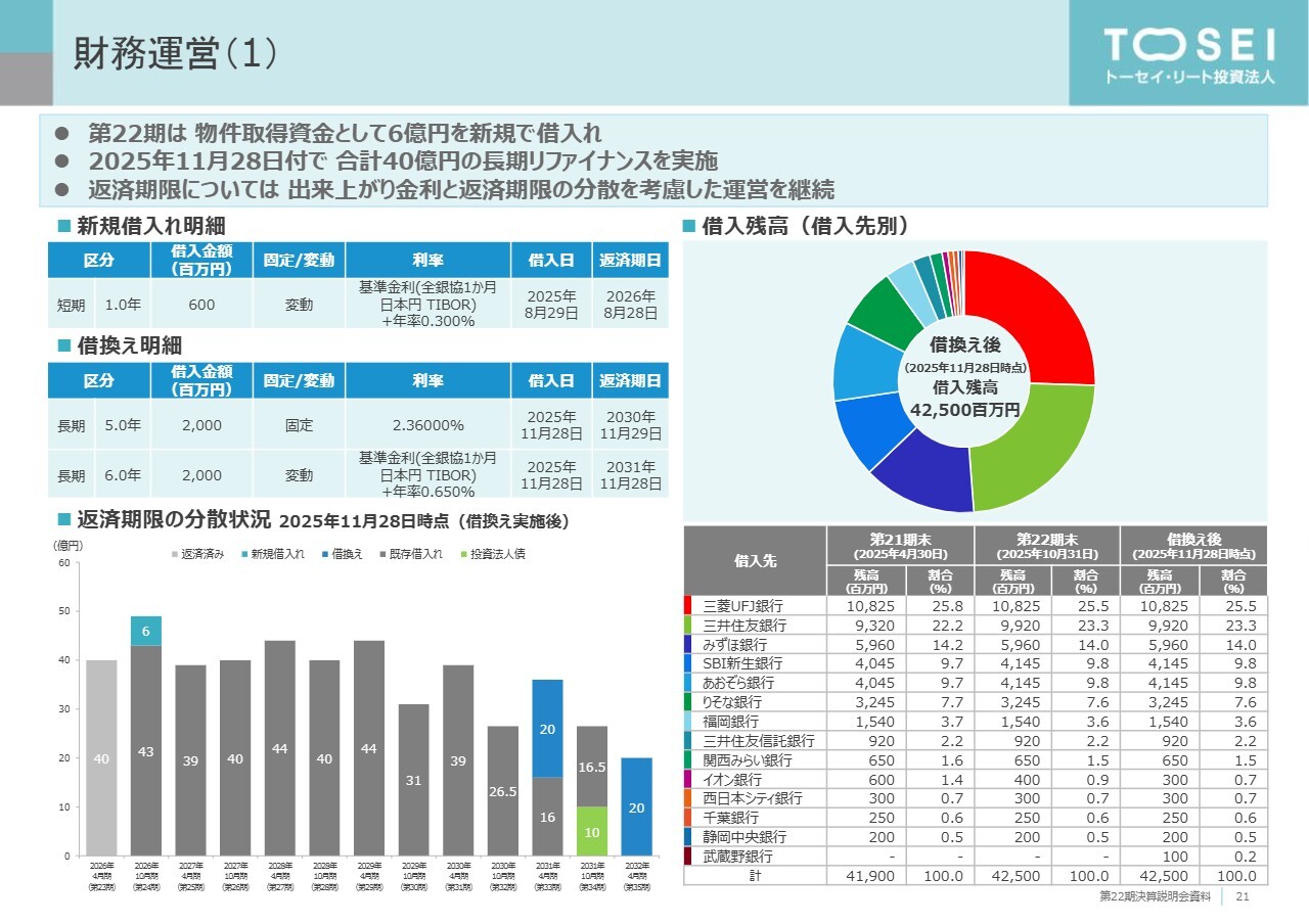 財務運営についてです。2025年8月末に物件取得資金の一部として、6億円のブリッジローンを実行しました。また、11月末には合計40億円の長期借入を実施しました。返済期限は5年と6年で調達し、出来上がり金利と返済期限の分散を考慮した運営を行っています。