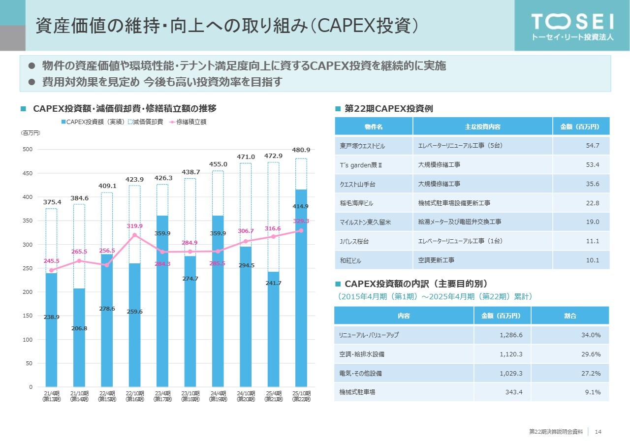 CAPEX投資についてご説明します。第22期も、物件の資産価値、環境性能、テナント満足度向上に寄与するCAPEX投資を積極的に進めてきました。費用対効果を見極めた投資を心がけ、稼働率の向上と賃料水準の引き上げにつなげています。