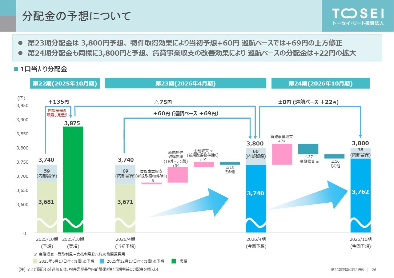 最初に分配金についてです。2026年4月期の分配金は、前回予想から60円上方修正し、3,800円としています。また、巡航ベースの分配金でも69円の上方修正となっています。