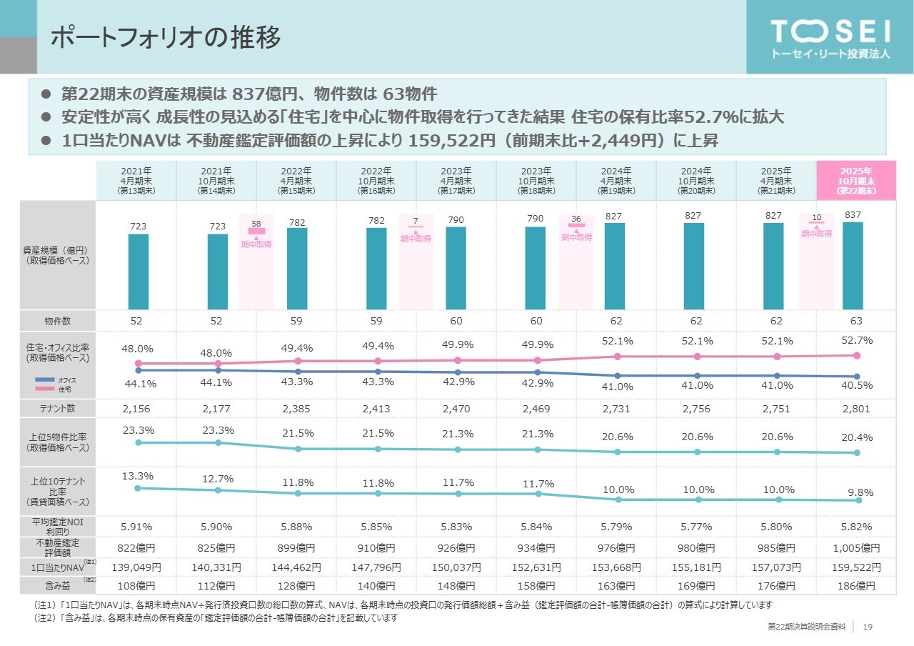 ポートフォリオの推移です。第22期末の資産規模は837億円、物件数は63物件となりました。直近では、住宅を中心に物件取得を進めた結果、住宅の保有比率が52.7パーセントとなり、安定性を維持しつつ成長性を確保しています。