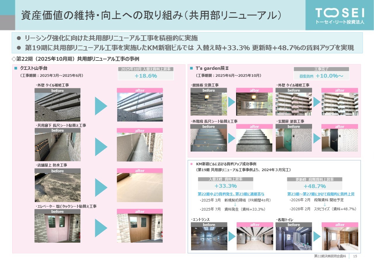 スライド右下の「KM新宿ビル」は、第19期に実施した共用部リニューアル工事により、大口の賃料増額に成功した物件です。入替えでは、2025年3月に33.3パーセント増額で成約し、2025年7月半ばより賃料が発生し、第23期には通期で寄与する予定です。