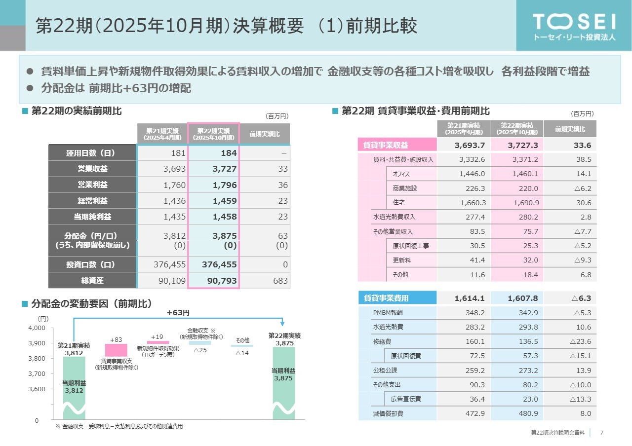 第22期は、賃料単価の上昇や物件取得効果による賃料収入の増加により、支払金利や各種コスト増加をカバーし、各利益段階で増益を確保しました。分配金については、前期比で63円増配となりました。
