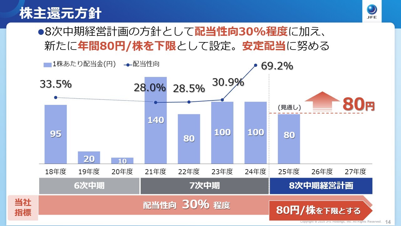 今年度発表した第8次中期経営計画では、従来の配当性向30パーセントに加え、安定的な配当を実施する観点から80円を下限とする方針を掲げました。厳しい事業環境ではありますが、成長戦略を確実に実行し、より多くの配当を実現できるよう取り組んでいきます。