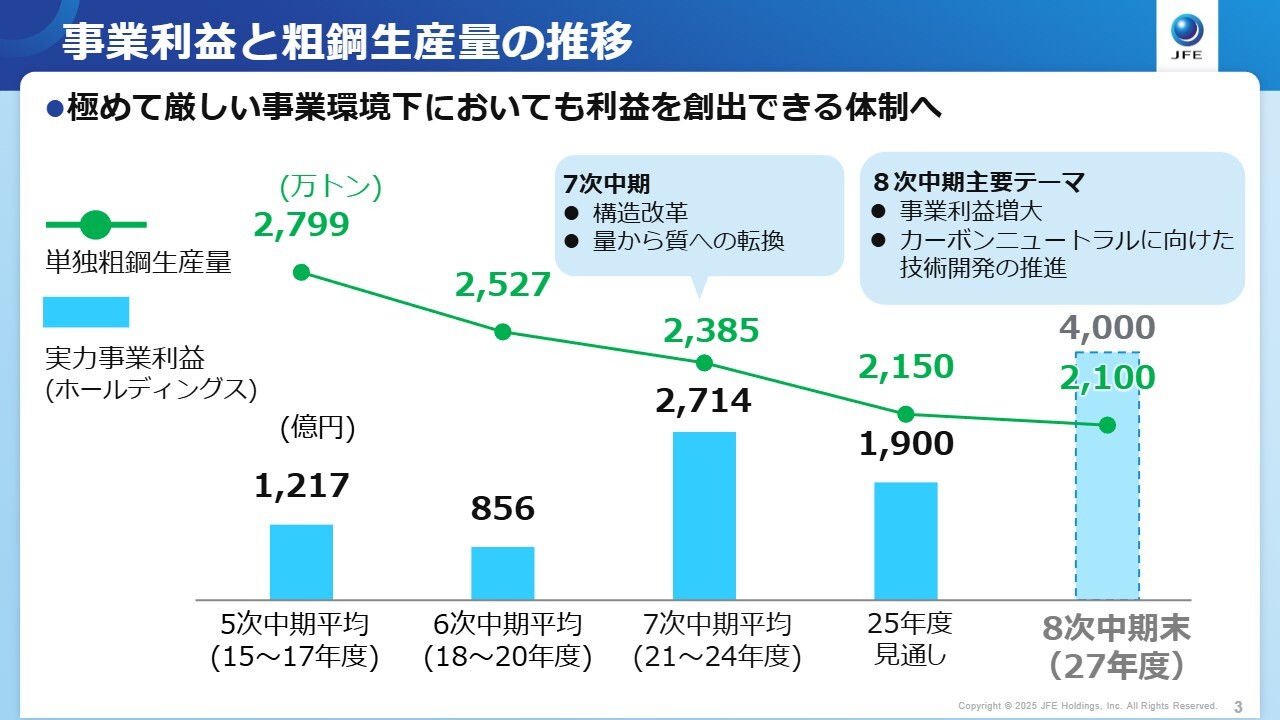 2025年度も引き続き厳しい事業環境が続いていますが、後ほど詳しくご説明する8次中期の主要テーマを着実に進めることで、きわめて厳しい事業環境下においても利益を創出できる体制を整えていきます。