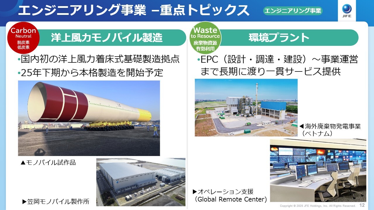 北野:高付加価値品戦略は、国内における大規模成長投資により実行していく考えです。後ほど述べますが、JFEエンジニアリングの洋上風力用モノパイル製造工場が、本年度中に本格製造を開始します。このモノパイル向けの大単重厚板を供給していきます。