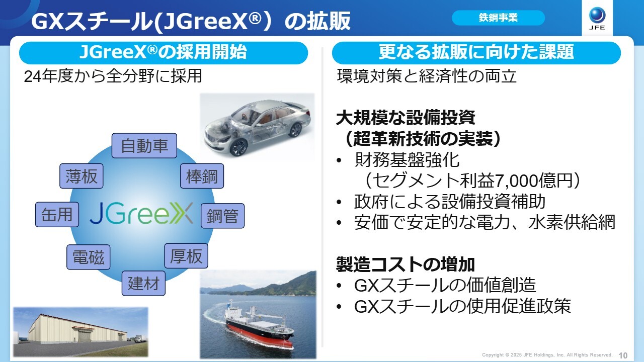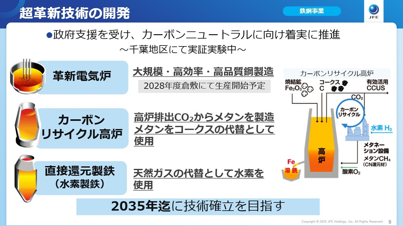 一方、環境に関しては、2028年度に倉敷地区で稼働予定の革新電気炉の建設を着実に進めていきます。さらに、超革新技術の開発もスピードを緩めることなく、研究開発を推進していきます。また、GHG排出量を大幅に削減した「GXスチール」の拡販も進めていきます。