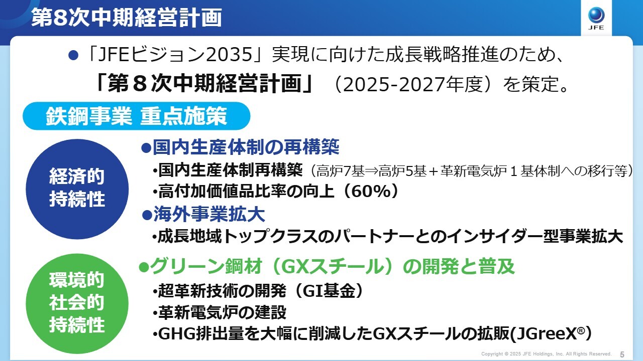 佐藤:今後の戦略についてです。今年5月に長期ビジョンとなる「JFEビジョン2035」と、2025年度から2027年度の3年間にわたる第8次中期経営計画を発表しました。