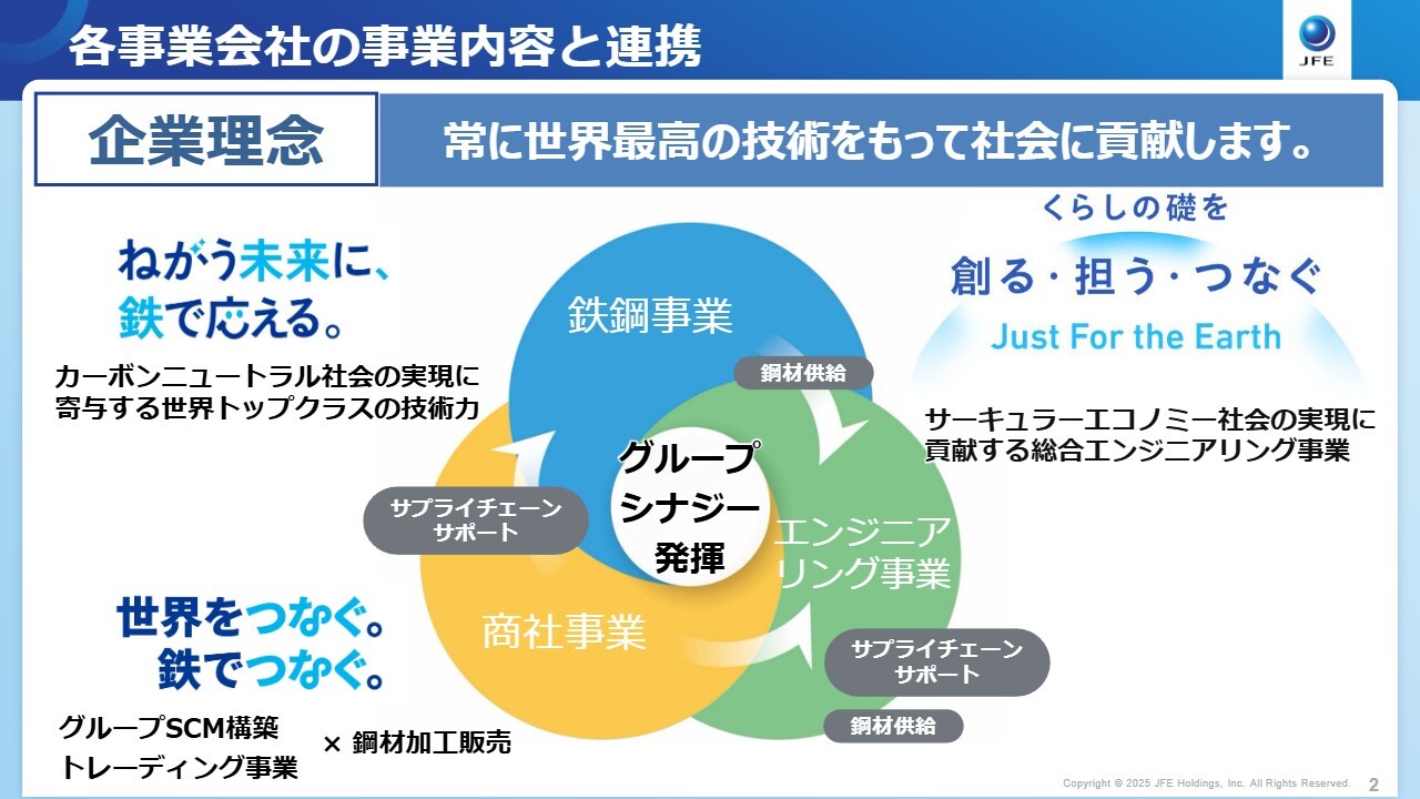 佐藤:3つの事業会社があるということですが、JFEグループは「常に世界最高の技術をもって社会に貢献します。」という企業理念のもとで、それぞれの事業を結び付けてグループシナジーを最大限に発揮しています。それぞれのパーパスはスライドに記載のとおりです。