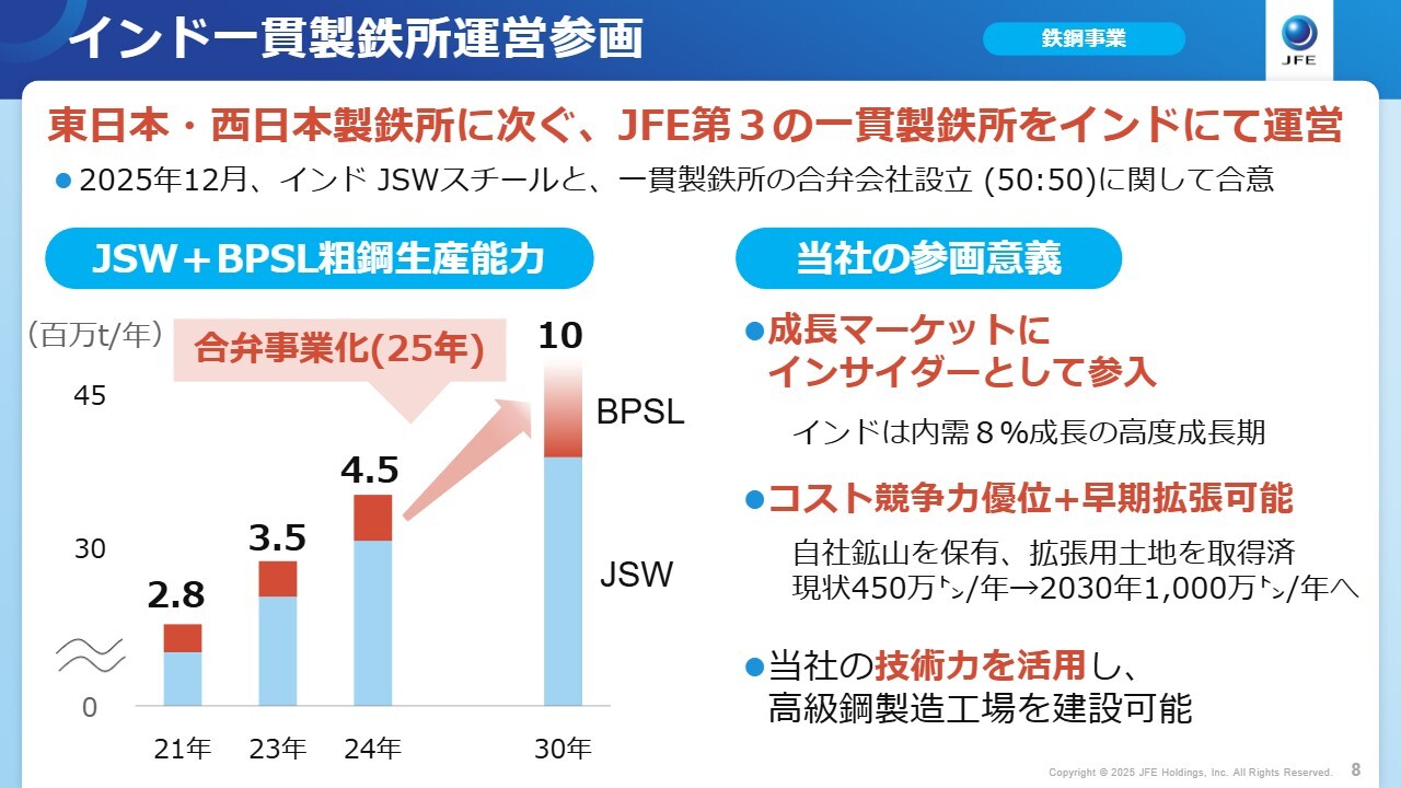 これにより、電力用電磁鋼板においてインド国内で圧倒的なシェアを持つNo.1サプライヤーとなることを目指しています。また、先般12月3日に公表した一貫製鉄所の合弁会社設立について、JSWスチール社と合意に至りました。
