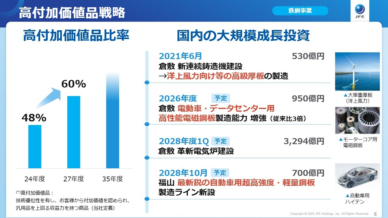 また、電動車やデータセンター向けの高性能電磁鋼板についても製造能力を従来比で3倍に高める予定です。これらの施策も成長投資および設備投資によるものです。着実に実行し、高付加価値品比率を2027年度に60パーセントに高める計画です。