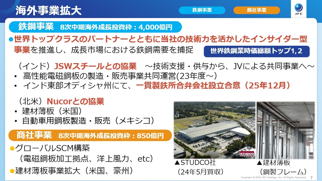 一方、北米では、北米No.1のNucor社と協業しており、現在2件のジョイントベンチャーを運営していますが、さらなる協業について検討している最中です。