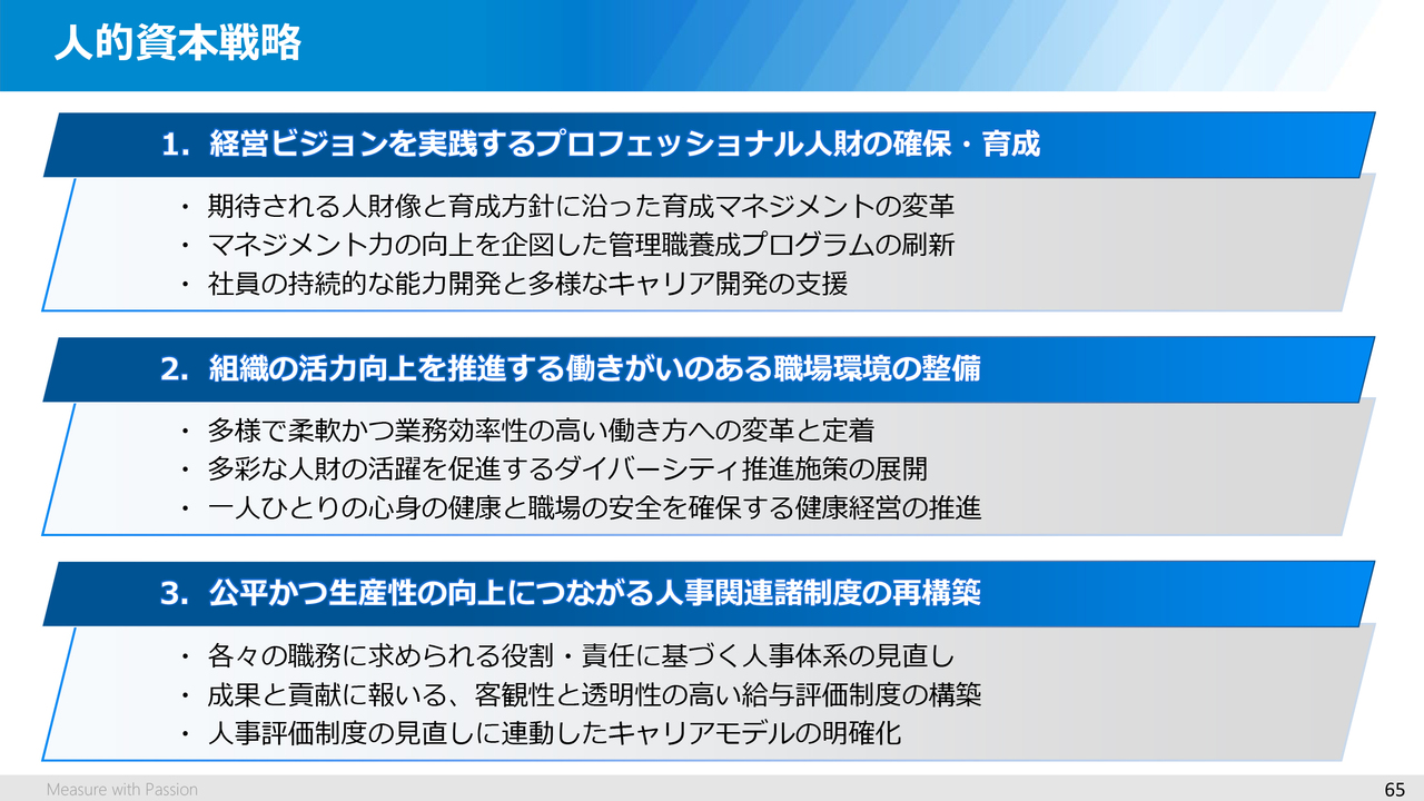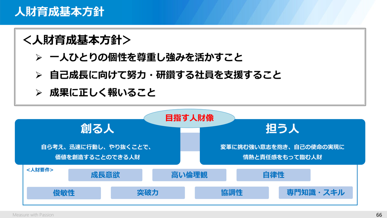 回答:ご質問ありがとうございます。65ページから66ページのスライドでご説明します。当社の人的資本戦略の全体像についてお話しします。