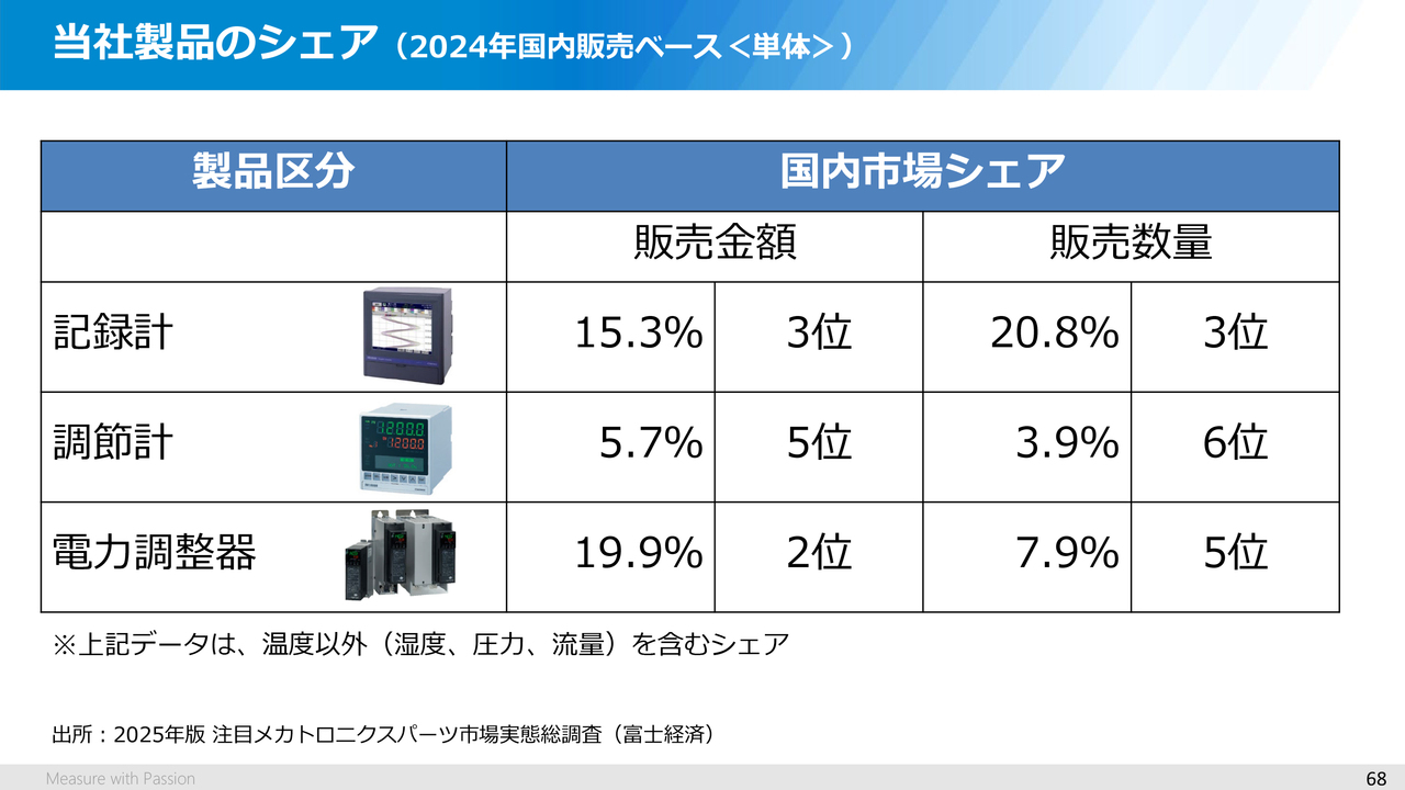 回答:ご質問ありがとうございます。68ページのスライドでご説明します。当社製品すべてにわたる調査結果はありませんが、計測・制御・機器関係の製品別のシェアについては富士経済さまが調査をされています。実際には各メーカーに聞き取り調査をするわけですが、2024年の販売実績について調査した結果が公表されていますので、ご紹介します。