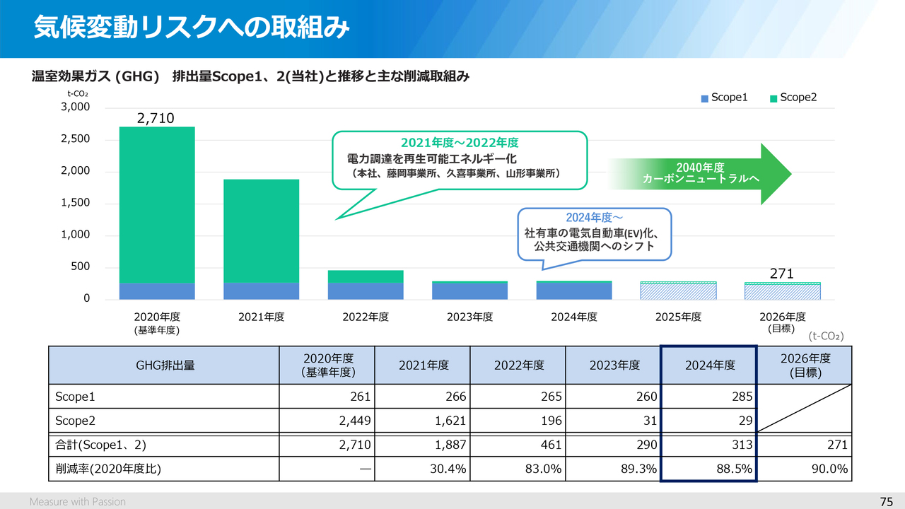 回答:ご質問ありがとうございます。75ページのスライドでご説明します。気候変動リスクへの取組みですが、当社は、気候変動リスク対応がサステナビリティ経営の最重要課題と位置づけ、2040年度までに温室効果ガスのうち、燃料等の使用による排出である「Scope1」と購入電力等の使用による排出である「Scope2」の排出量ゼロを目指しています。
