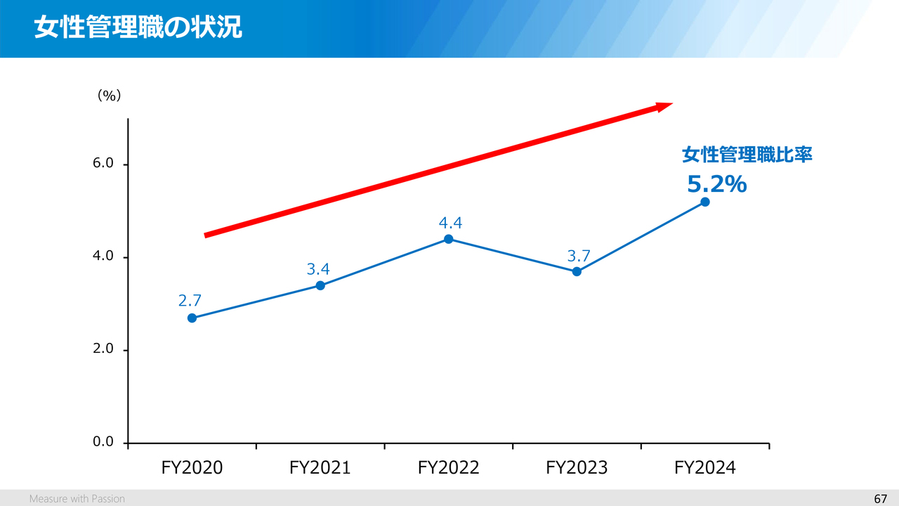 回答:ご質問ありがとうございます。67ページのスライドでご説明します。女性管理職の割合ですが、このグラフにあるとおり、毎年少しずつ上昇し、2025年3月末では5.2パーセントとなりました。また、女性管理職の割合の目標値は7パーセントに設定しています。