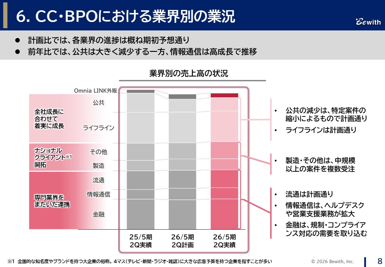 補足説明しますと、売上高は、期初計画で織り込んでいた特定の大型公共案件縮小の影響がありましたが、金融業界および情報通信業界での新規顧客の獲得や既存顧客の拡大により、一定程度カバーできている状況です。