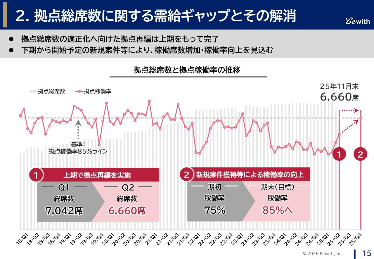はじめに、短期プランの1つ目である「拠点総席数に関する需給ギャップとその解消」についてです。拠点総席数の最適化へ向けた拠点再編は、上期をもって計画どおり完了しました。