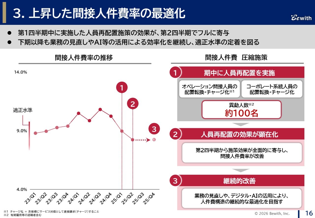 第1四半期の期中に実施した人員再配置では、原価部門で非請求扱いであった人員や、販管部門であるコーポレート系人員を中心にオペレーション現場への配置転換を行い、合計約100名の異動を実施しました。この施策により、間接人件費率は適正水準に改善しています。