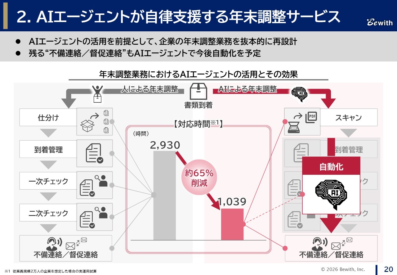 続いて、AIエージェントが自律支援する年末調整サービスについてです。スライド左側に示した従来の年末調整業務では、書類到着から「仕分け」「到着管理」「一次チェック」「二次チェック」「不備連絡・督促連絡」という多くの工程を人手で行っており、担当者に大きな負担がかかっていました。