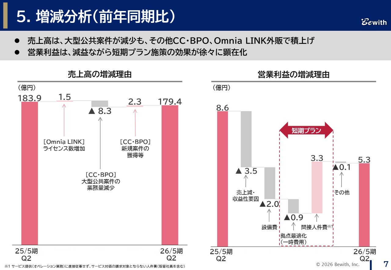 コンタクトセンター・BPO事業では、公共分野における特定の大型案件の縮小が引き続き影響していますが、これは期初の見込みどおりです。
