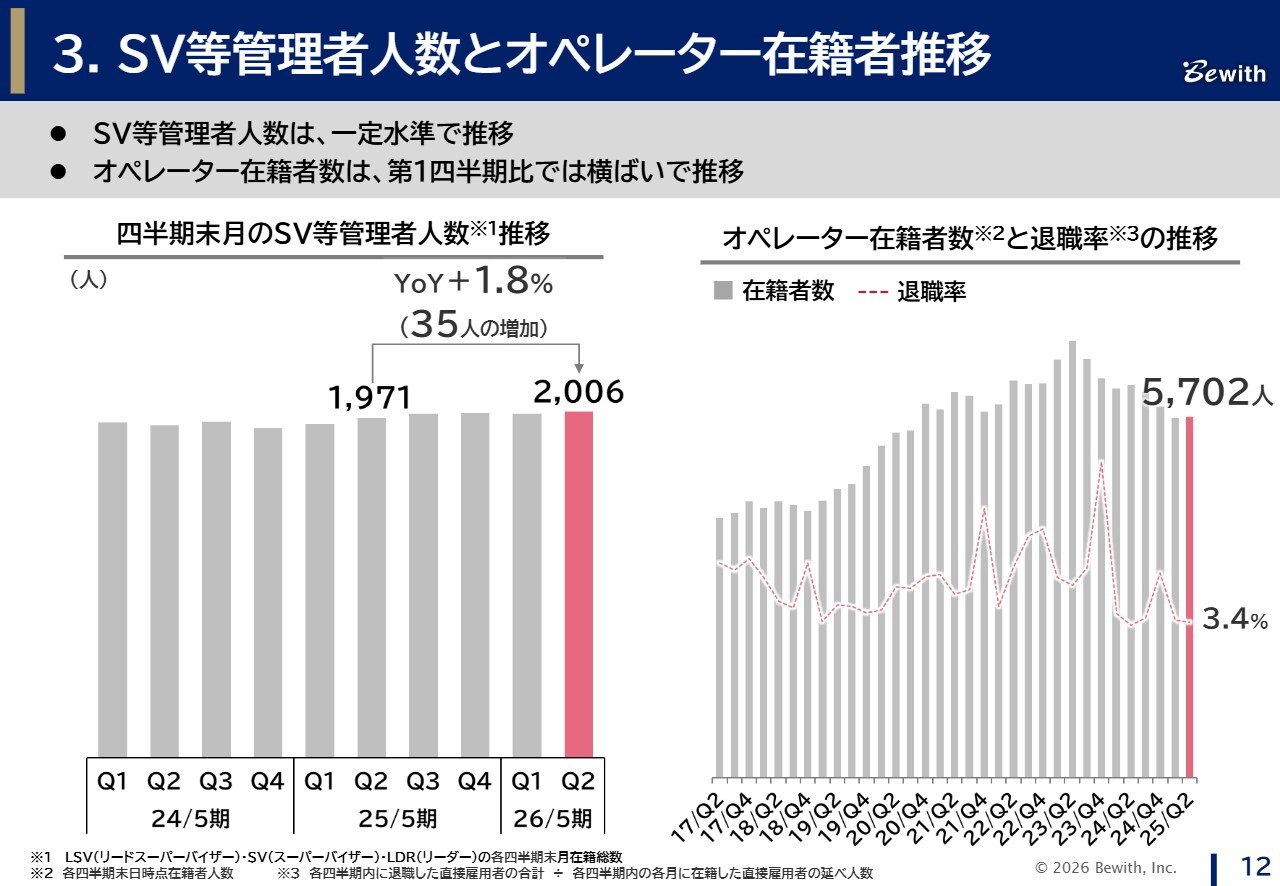 SVなどの管理者人数は、一定水準を維持しつつ微増しています。スライド右側のグラフにあるオペレーター在籍数は、売上高に応じて横ばいで推移しています。退職率は、各種取り組みの効果により低水準を保っており、人材面は引き続き安定しています。
