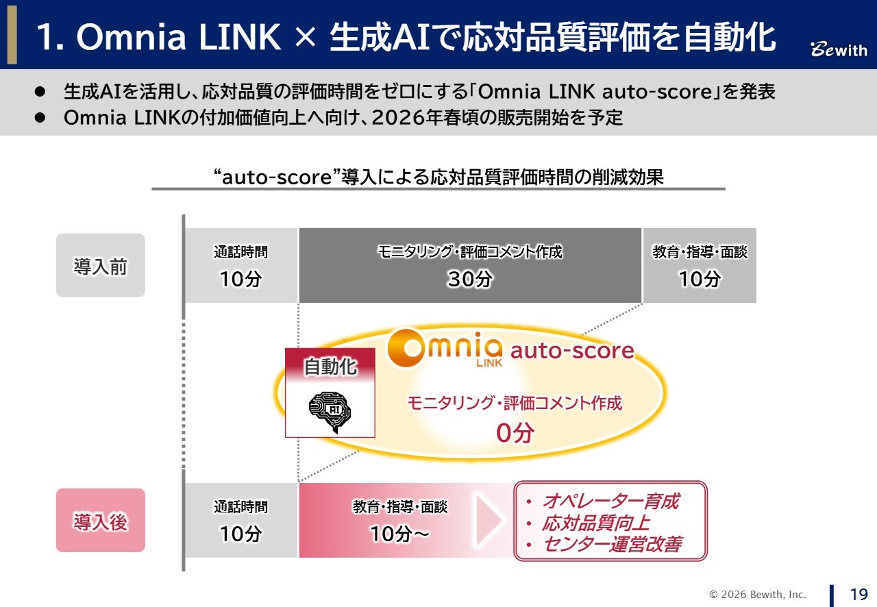「Omnia LINK」は、これまでも生成AIを活用していましたが、今回、応対品質評価においても生成AIを活用することで自動化が可能となりました。