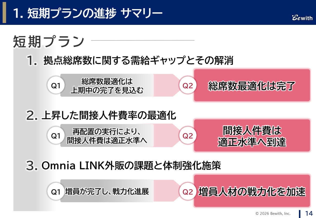 短期プランの1つである拠点総席数の最適化に伴う一時費用は、第2四半期にも発生しましたが、上期で完了しています。下期以降は、拠点の最適化に加え、短期プランの他の施策である再配置した人材の戦力化とあわせて、安定的に利益を出せる体質に戻ってきていると考えています。