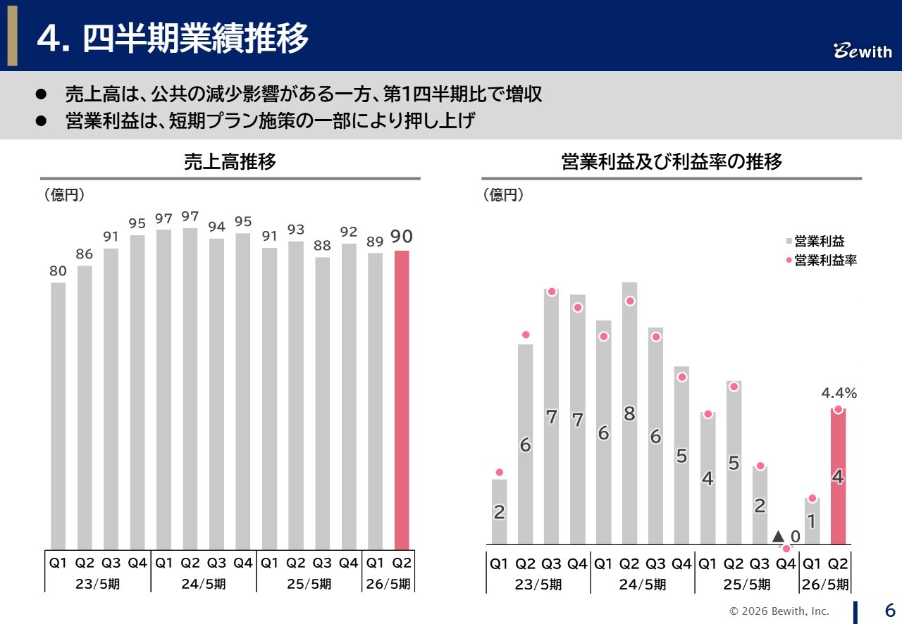 飯島:はじめに、四半期ごとの業績推移についてご説明します。スライド左側のグラフに売上高推移を示しています。第2四半期の売上高は90億円となり、公共分野における案件縮小の影響を受けながらも、第1四半期から増収となりました。