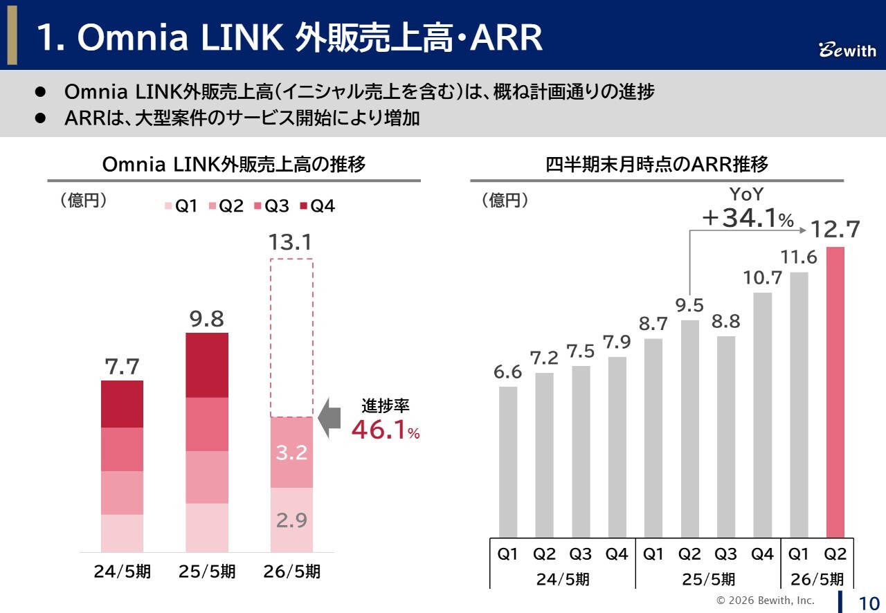 一方、新規案件の獲得も一定程度進んでおり、売上高は計画どおり、営業利益は計画を上回る回復となっています。当社の強みである「Omnia LINK」外販では、大型案件の出荷が進み、ARRおよびライセンス数ともに大幅に成長しました。