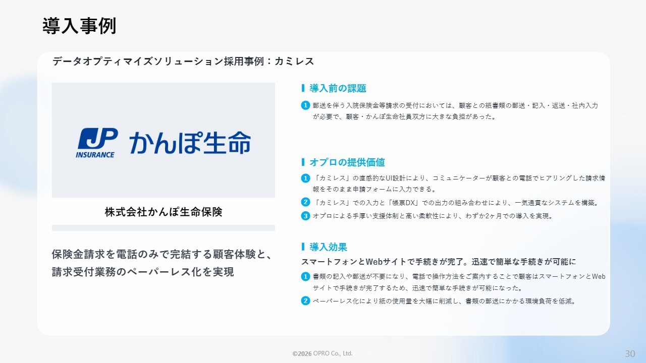 最近の導入事例として、株式会社かんぽ生命保険での採用事例があります。コールセンターにおいて保険金の支払い業務に「カミレス」を導入することで、業務負荷を大幅に軽減しています。翌日には入金を実現するスピーディなビジネスも体現しています。