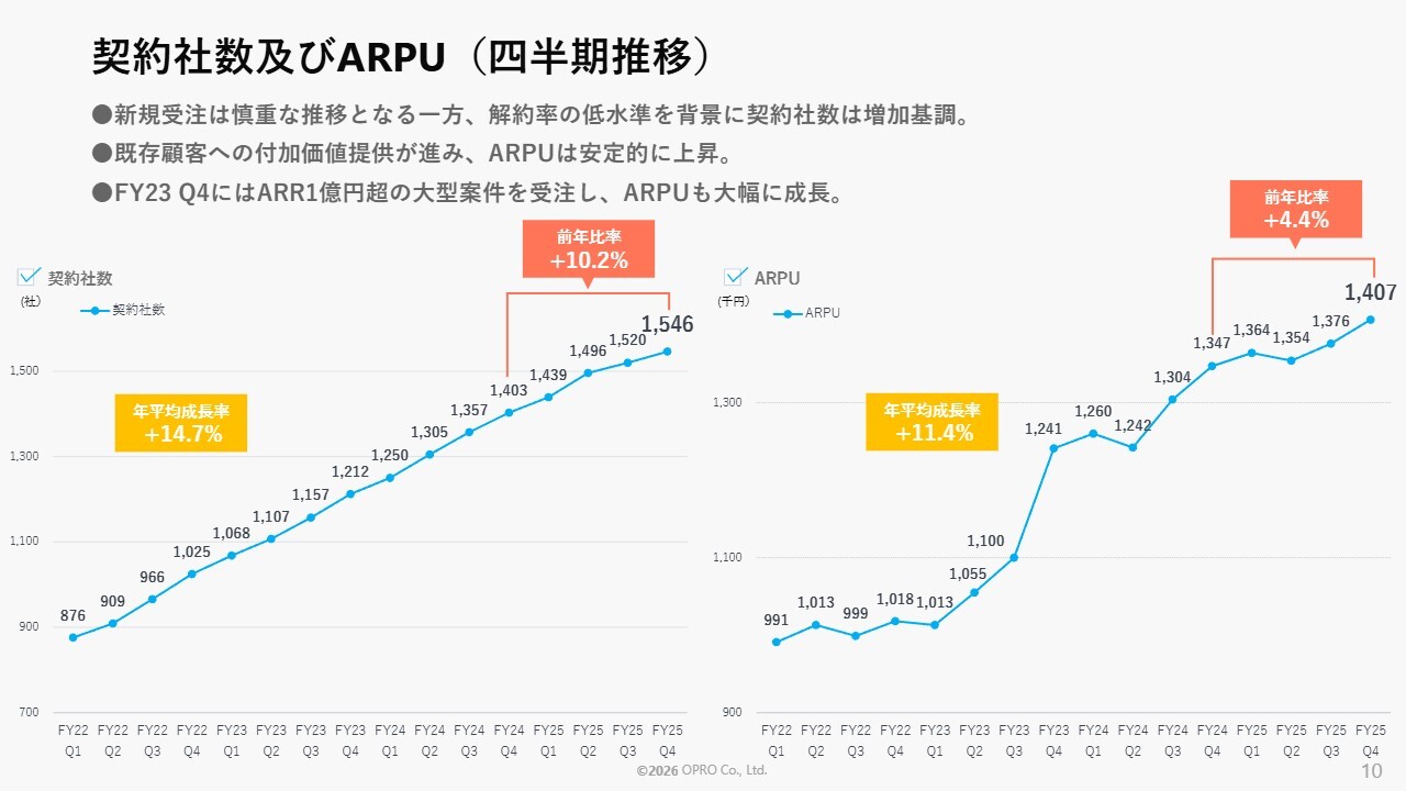 契約社数およびARPUの四半期推移です。契約社数は前期比プラス10.2パーセント、ARPUは104万7,000円と順調に推移しています。