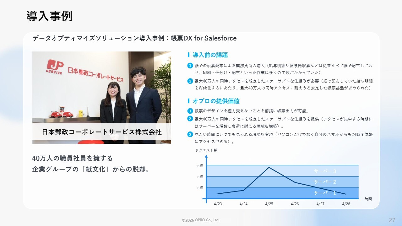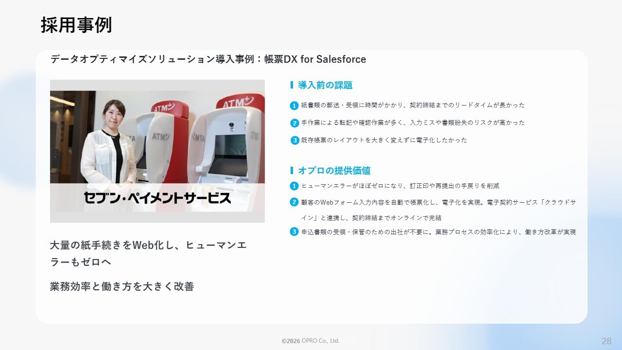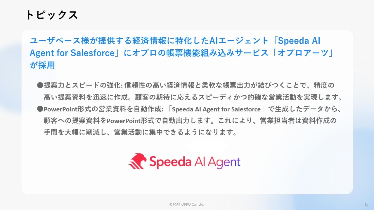 その1つとして、先ほども触れたユーザベース社への「oproarts」が挙げられます。ユーザベース社の新しいAIエージェントサービス「Speeda AI Agent for Salesforce」に採用いただきました。