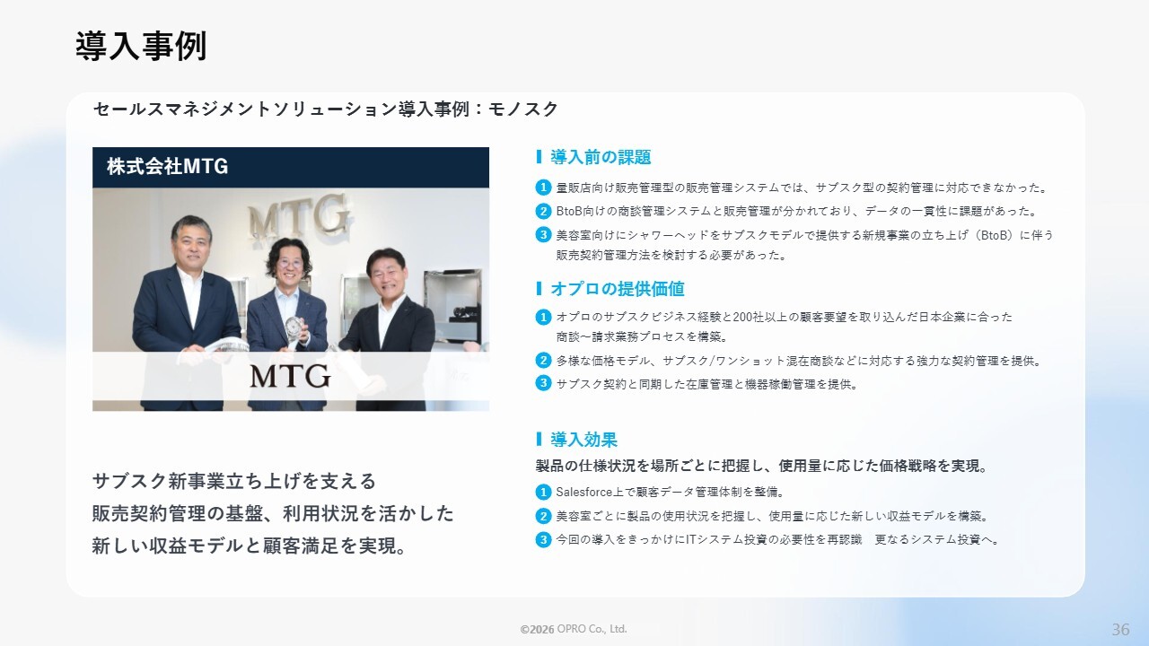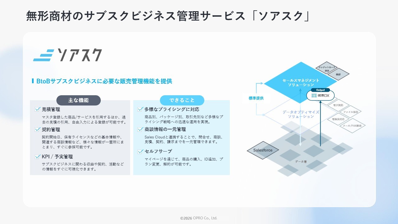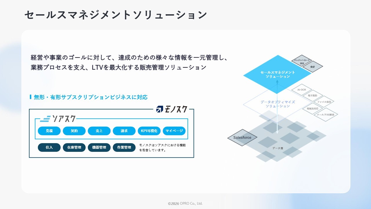 もう1つはセールスマネジメントソリューションです。いわゆる販売管理ソリューションで、特にサブスクリプションビジネスの販売管理に強みを持っています。