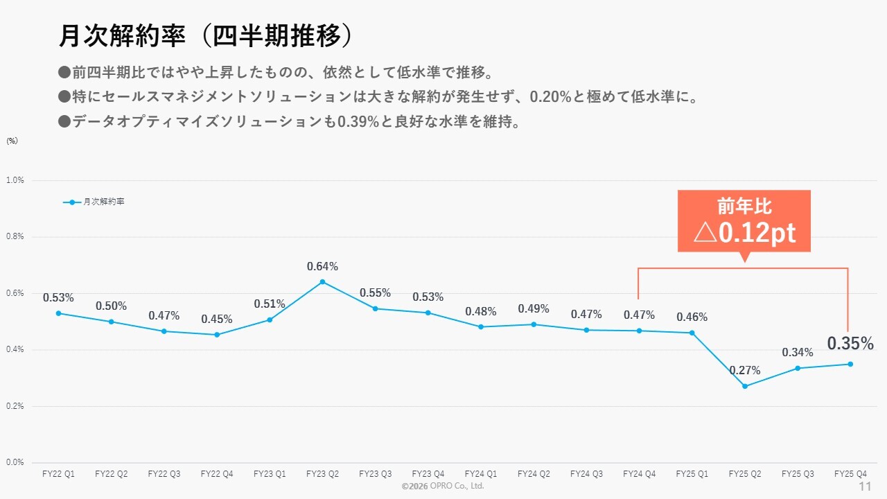 月次解約率の四半期推移です。低い水準で安定しており、今年は0.35パーセントで着地しました。引き続き、この低い解約率を維持していきたいと考えています。