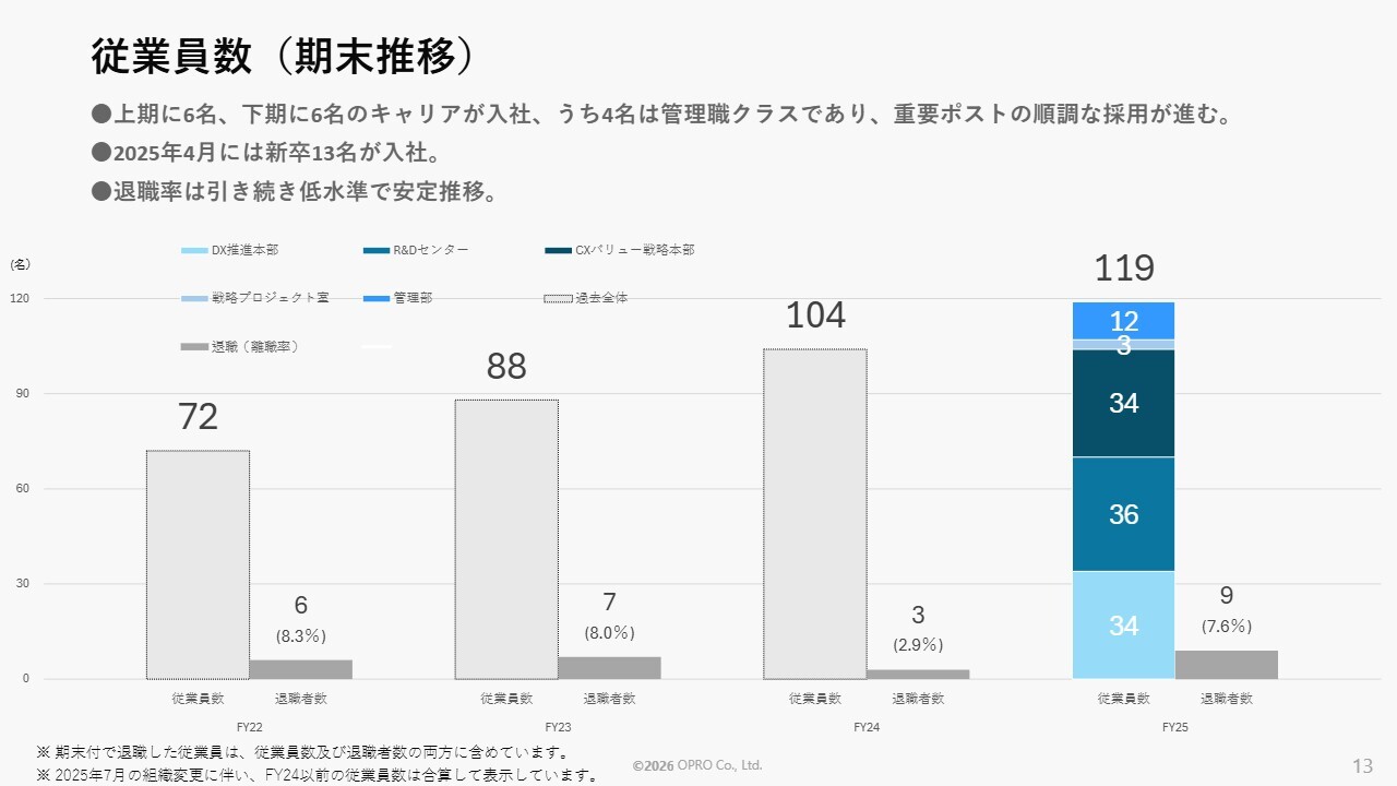 従業員数です。上期に6名、下期に6名のキャリア人材が入社しました。そのうち4名は管理職クラスであり、重要なポストで順調に採用を進められた1年となりました。また、2025年4月には新卒社員が13名入社し、結果として従業員数は119名となっています。