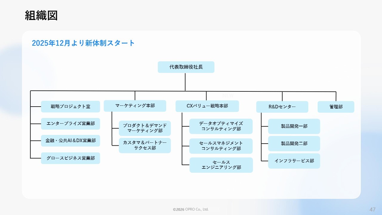 エンタープライズ営業部の部長には椿、金融・公共AI&DX営業部の部長には石川、グロースビジネス営業部の部長には本田を任命しました。これらの執行役員が責任を持ってリードし、2026年11月期のチャレンジングな数値目標の達成に向けて進んでいきたいと考えています。